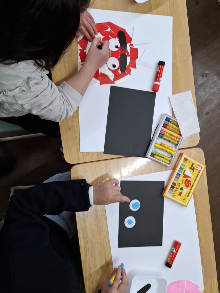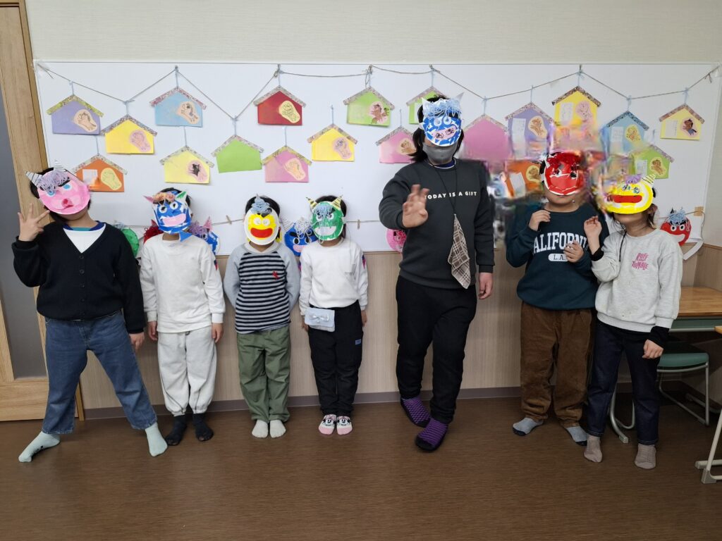 「強そうな赤鬼にする!」「私はかわいい鬼がいいな」など、子どもたちは角の位置や髪の毛を工夫しながら、それぞれ思い思いの表情を描いていきました。