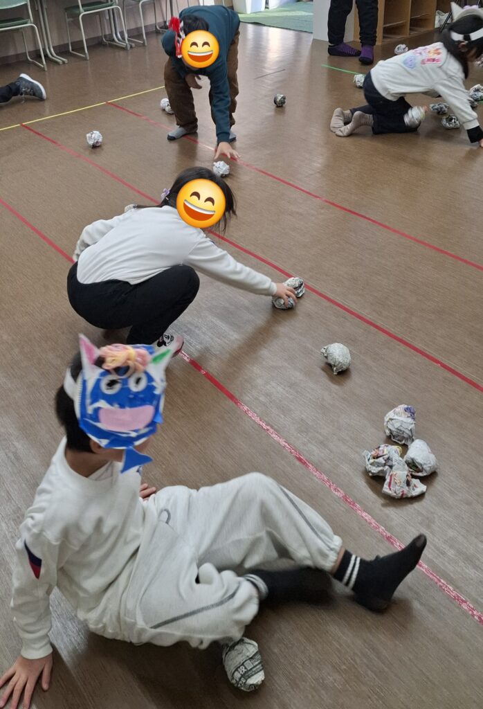 新聞紙を丸めて作った「特製豆」を使い、「おには〜そと!」と元気な声を響かせながら、みんなで力いっぱい豆を投げ合いました。