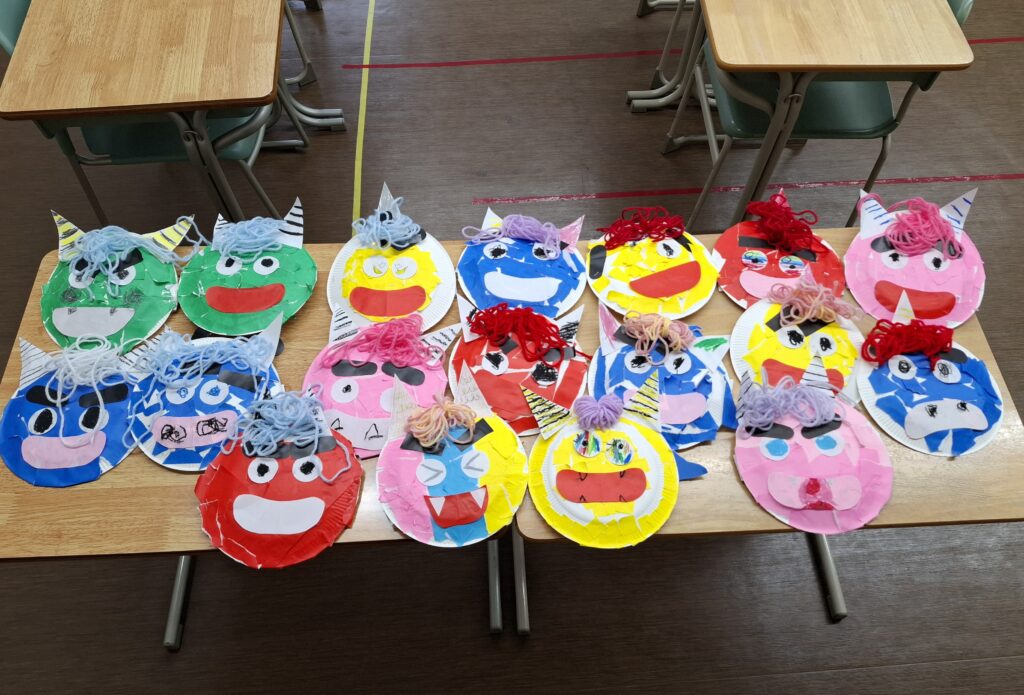 節分イベントでは、紙皿をベースにした世界に一つだけの「鬼のお面」作りに挑戦しました。