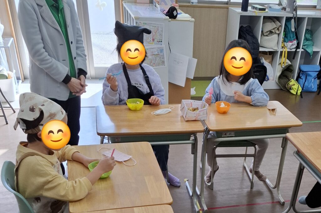自分で作った甘いスイーツを「おいしい!」と嬉しそうに味わい、みんなで楽しく完食しました。