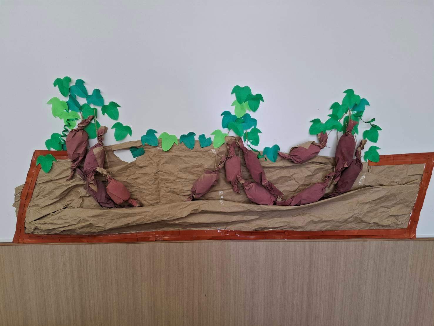 紙に大きな筆で色を塗り、丸めた新聞紙を包んでサツマイモを作りました🍠