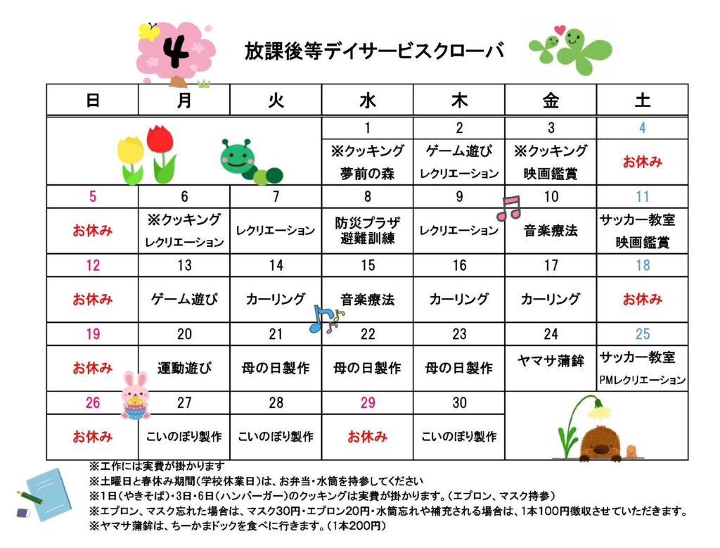 こんにちは!クローバ安室です🍀 4月の予定が決まりましたのでお知らせいたします🌷 新しいお友だちに会えるのも楽しみにしています☺ -